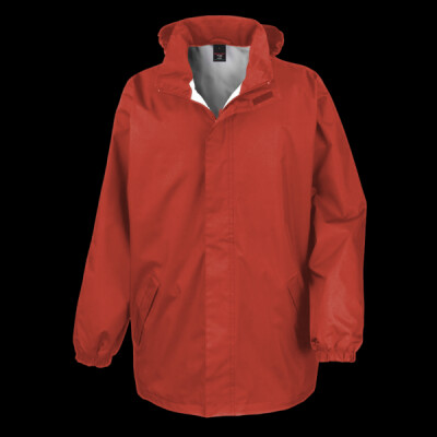 190T polyester pongee StormDri 2000 PU coating. Jersey lined body and polyester lined sleeves. Waterproof with taped seams. Windproof. Concealed adjustable hood. Tear release storm flap. Inner pockets. Two front pockets. Elasticated cuffs. Open hem. Cut out label. Access for decoration.