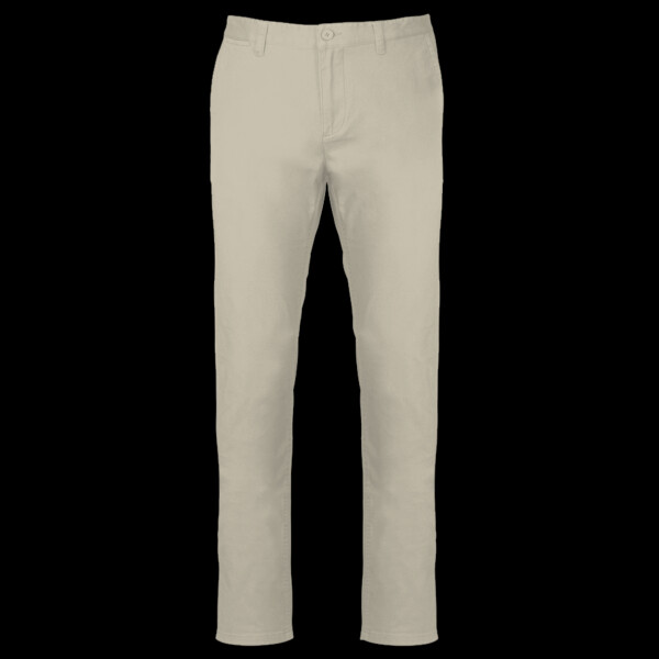 98% cotton twill/2% elastane. Enzyme washed. Modern style. Flat front. Belt loops. Zip fly with button over. Two side pockets. Ticket and coin pocket. Rear piped pockets.